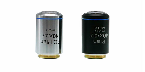 (5)多功能物镜,有的厂家生产一种多功能物镜,比如可以同时做相差,DIC,荧光等,这种物镜要稍微贵些。一般带有U标志,比如奥林巴斯的”UPLFLN”物镜和蔡司的”EC PLAN –NEOFLUAR”系列物镜。 3.按工作距离分类