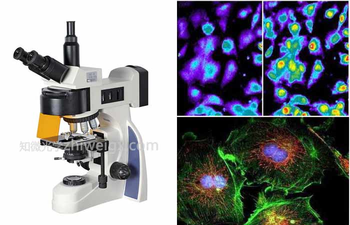 (Fluorescence microscope) : 荧光显微镜是以紫外线为光源, 用以照射被检物体, 使之发出荧光, 然后在显微镜下观察物体的形状及其所在位置。荧光显微镜用于研究细胞内物质的吸收、